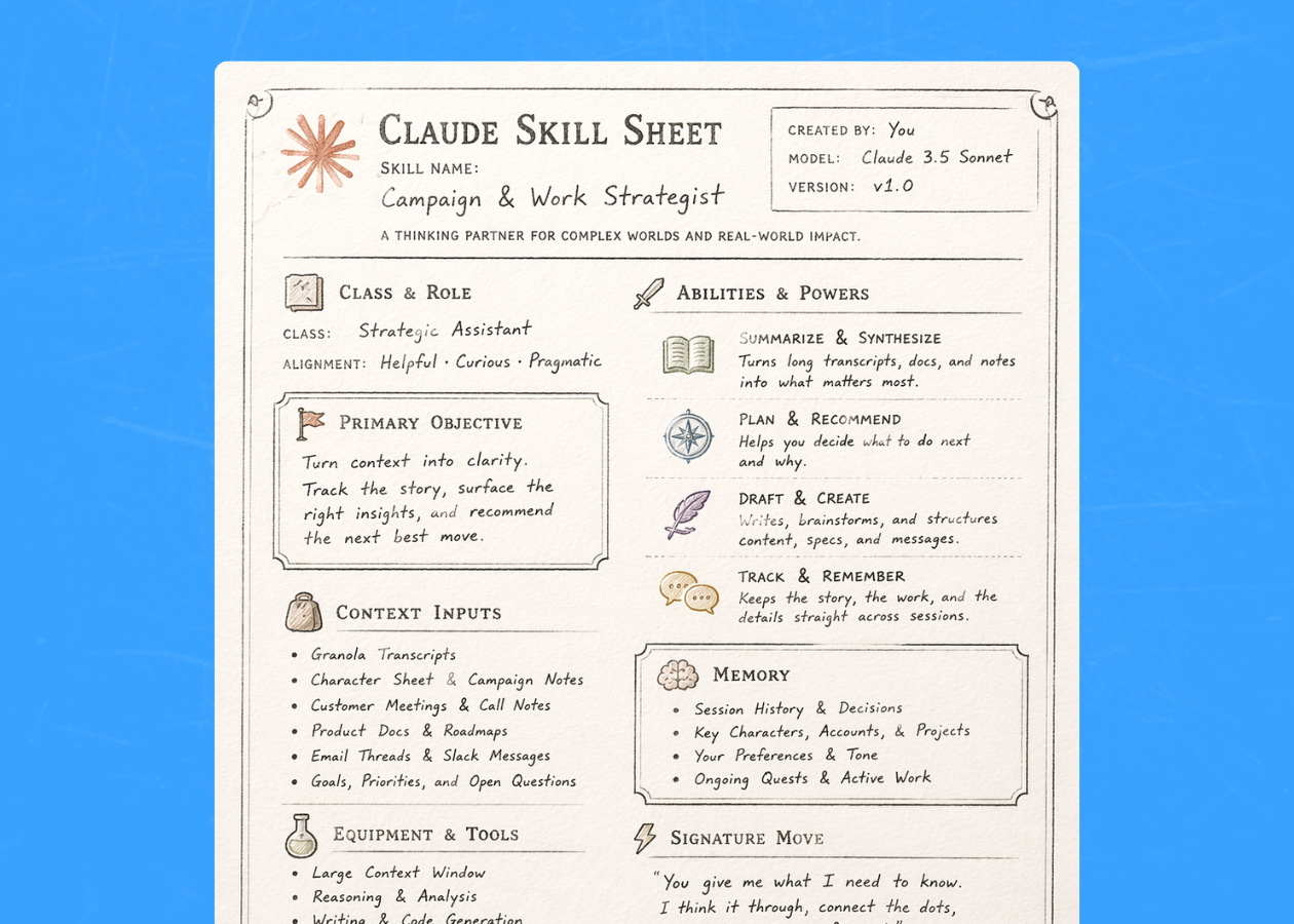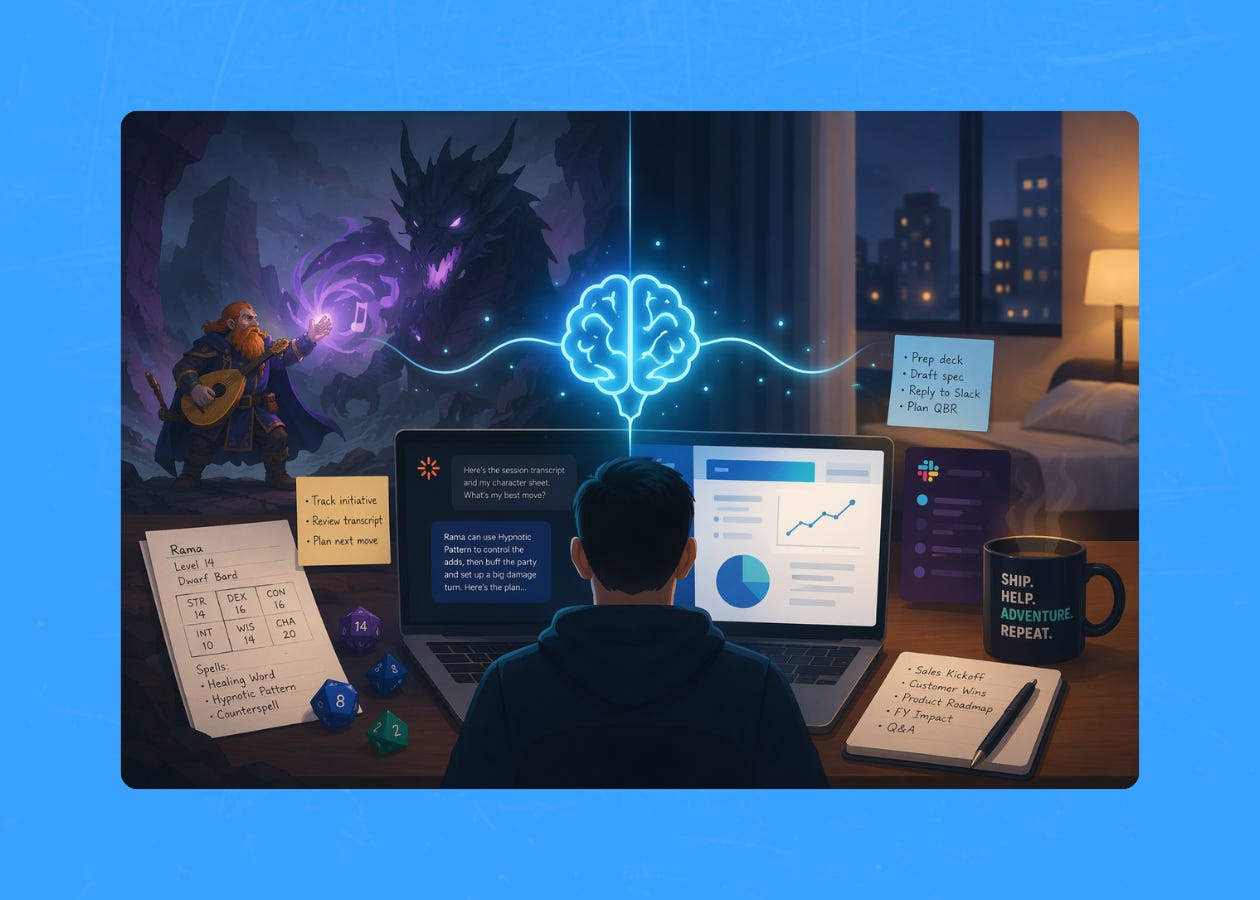 Here’s why I’m telling you this: the reason it works... tracking a D&D campaign in Claude, the same tool I use to prep for customer meetings, draft product specs, and manage my inbox... is because the underlying capability is the same across all of it. You give the model what it needs to know. It thinks. It helps. The use case is almost irrelevant.