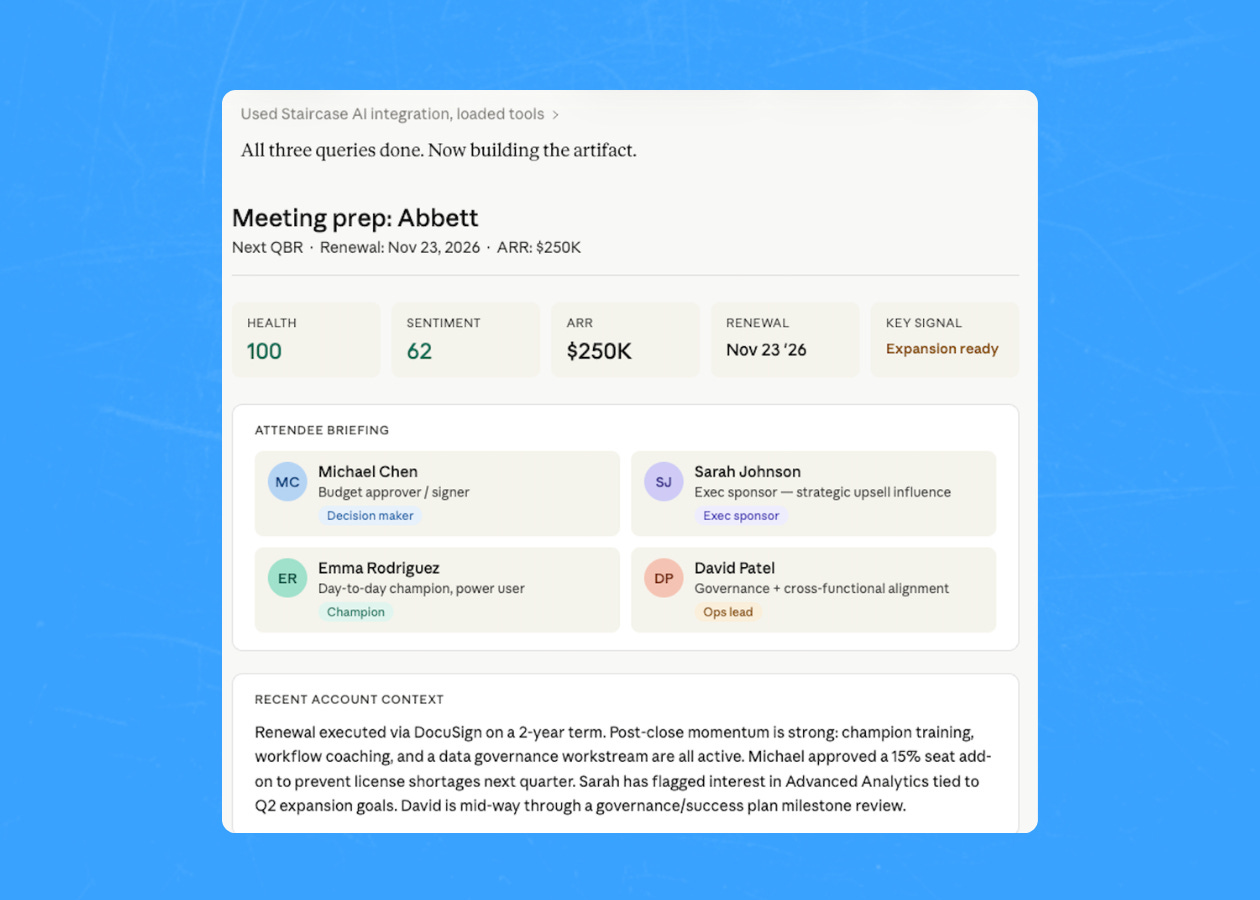 Here’s what my mornings look like now. I run my meeting prep every day off my Gainsight and Staircase AI MCP connections. Account data, calendar, relationship signals, all accessible to Claude at once. I type something like “prep me for my meeting with TigerConnect” and get a structured brief back before I’ve finished my coffee. Health scores, open risks, stakeholder context, recent communication sentiment, feature requests they’ve raised. Everything comes back at once rather than one piece at a time.