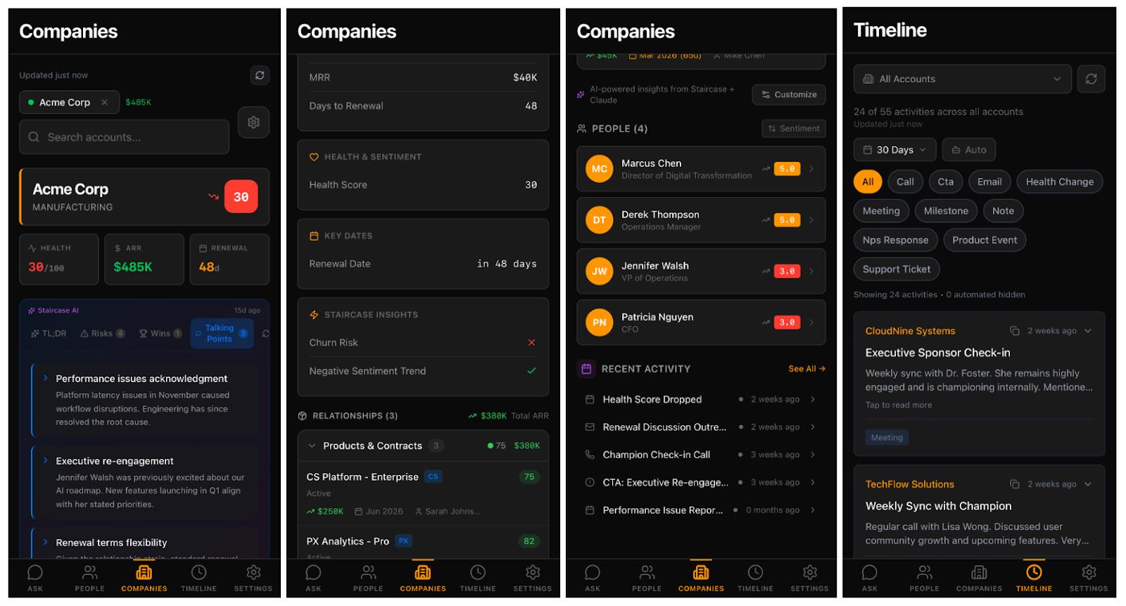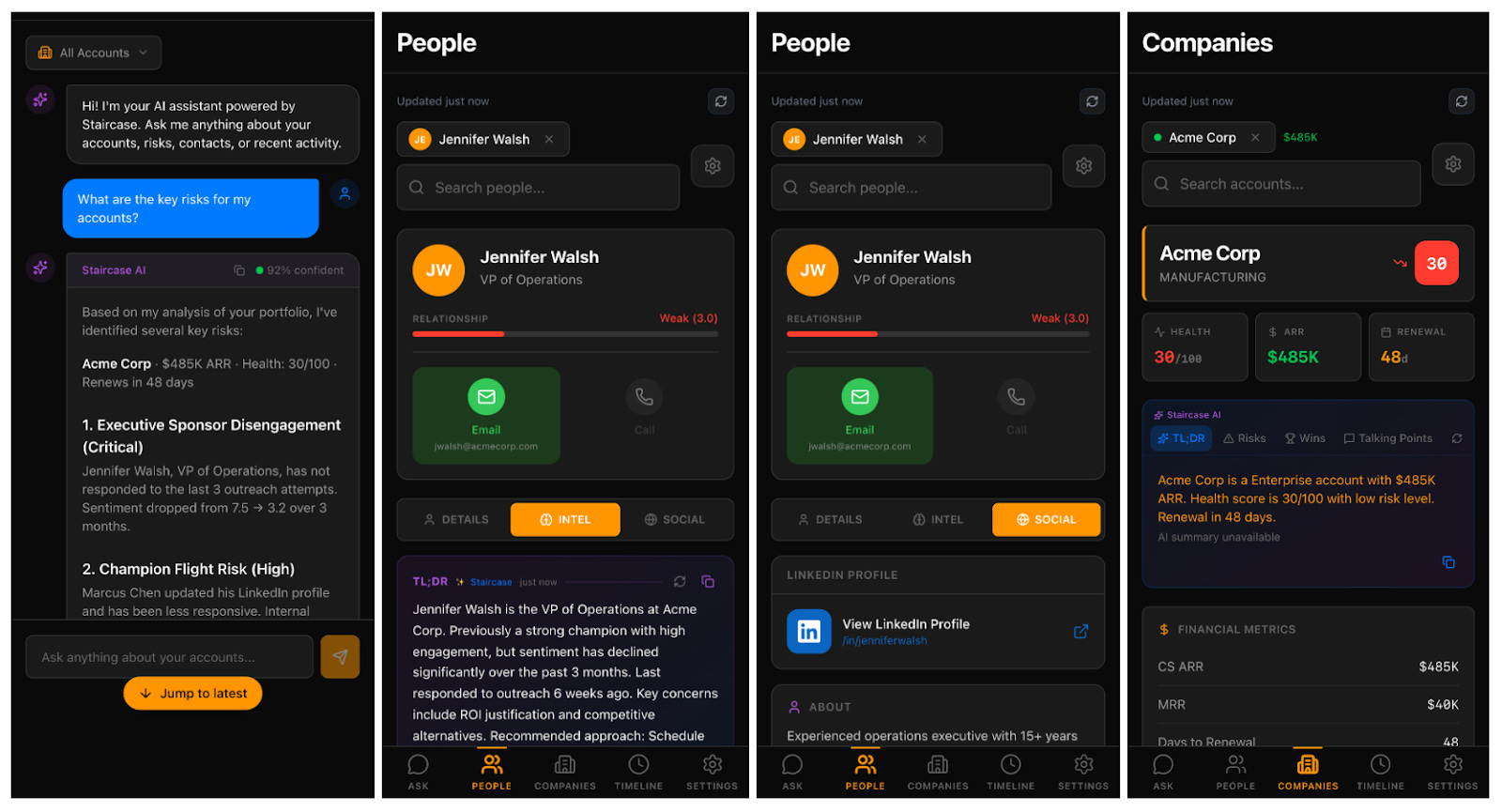 Aggregates information from Gainsight, Staircase, and LinkedIn in a way that gives you what you need at a glance.