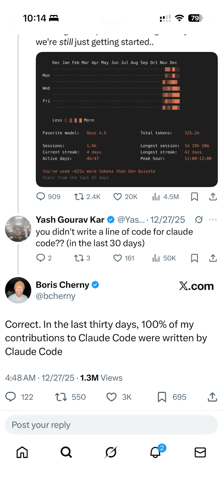 Boris Cherny, the creator of Claude Code at Anthropic, casually called out that 100% of the code he wrote in the last 30 days to enhance Claude Code was written by Claude Code. One. Hundred. Percent.