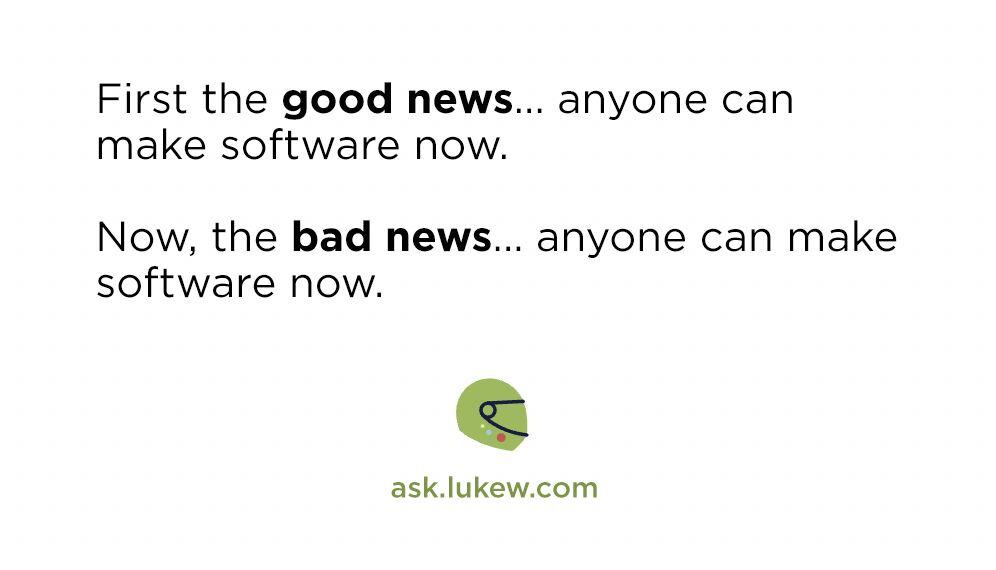 I’ve lived through every major platform shift since 1999. Client-server to web. Web to cloud. Cloud to social and mobile. Each one changed something important…where software ran, how it was delivered and monetized, when and with whom you could use it. But the thing that never changed: professional engineers wrote the code, companies sold it, customers bought it.