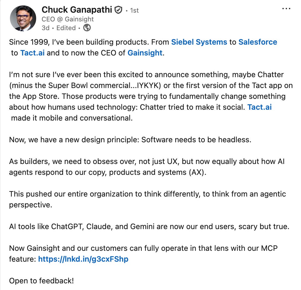 Gainsight CEO Chuck Ganapathi framed the design principle in a recent LinkedIn post: “Agents don’t need dashboards and buttons; they need context and the ability to act.”