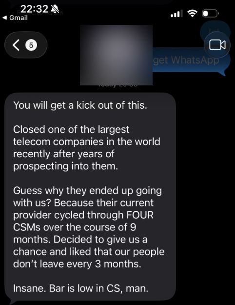 His colleague closed one of the largest telecom companies in the world after years of prospecting, because their previous vendor cycled through CSMs every few months and never got them to value. The win happened because CS failed at the other company. That’s the commercial consequence of getting this wrong.