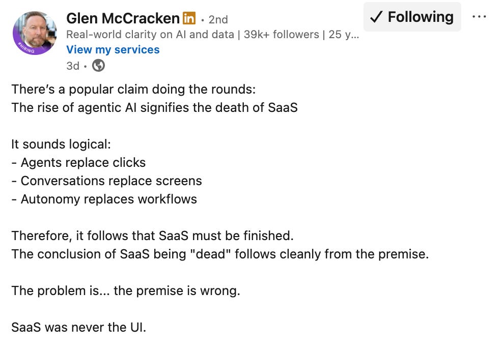Glen McCracken pushes back on the idea that agentic AI means the end of SaaS. The confusion, he argues, comes from treating the interface as the product. Screens were never the core of SaaS. They were simply the most visible layer.