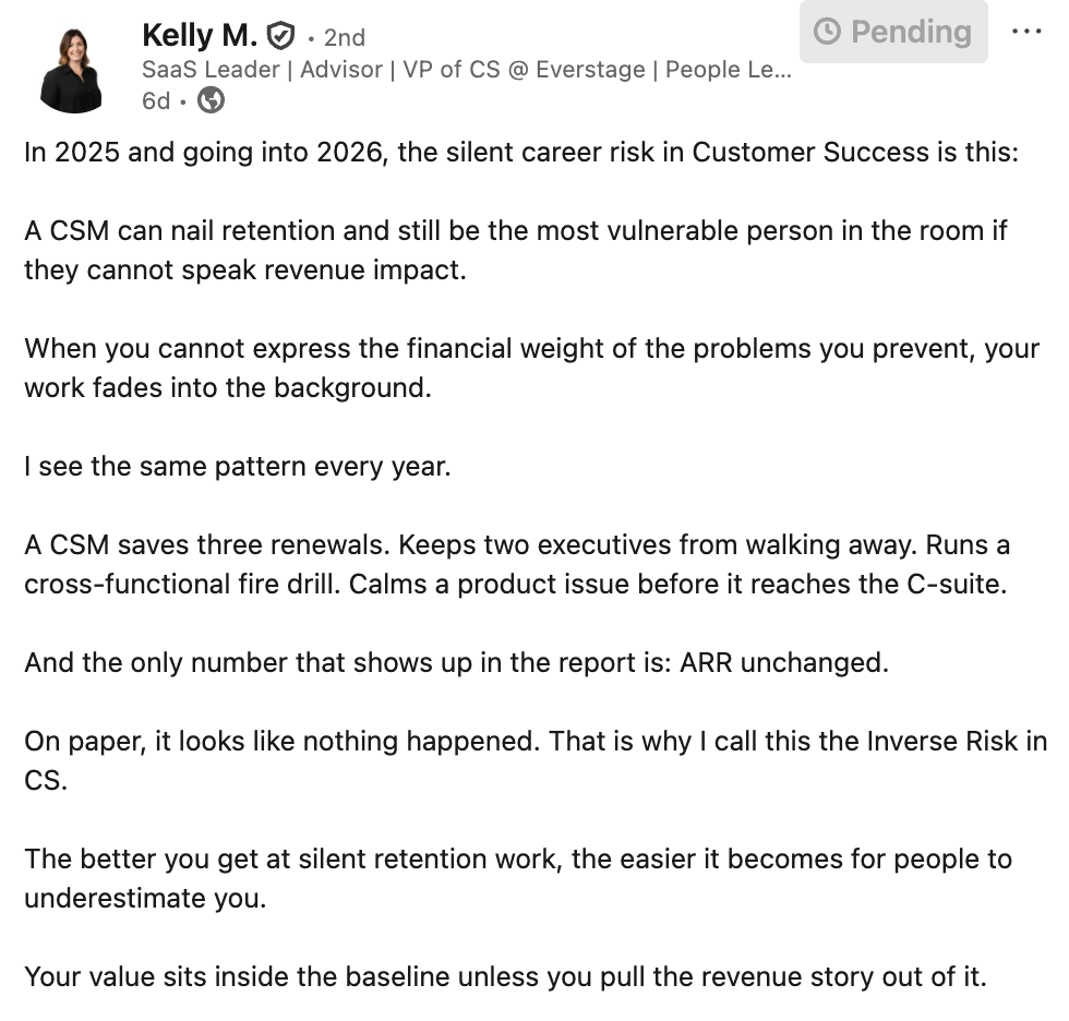 This becomes even more important as AI reshapes Customer Success. As automation raises the bar, leaders will prioritize roles that can clearly explain what revenue was protected and what risk was removed. Retention is risk management, but only if you can quantify it.
