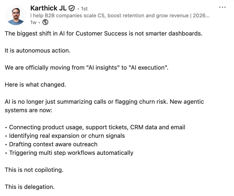 AI is forcing an operating model decision inside Customer Success. Karthick JL points out what happens when systems begin acting on customer signals rather than just surfacing them.